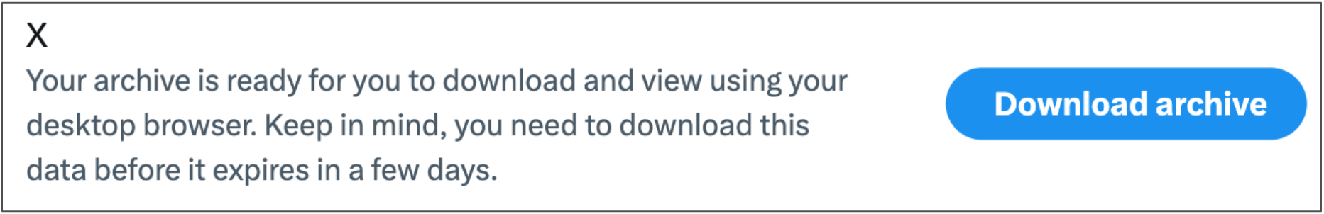 - You are able to download your account data on X. If you have not yet received a notification from X that your account data is available, please wait for that notification before beginning this part of the study.